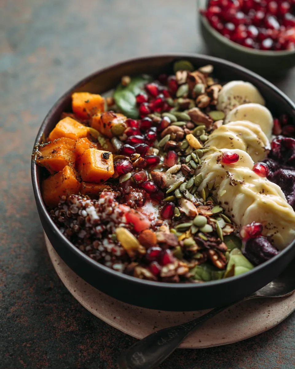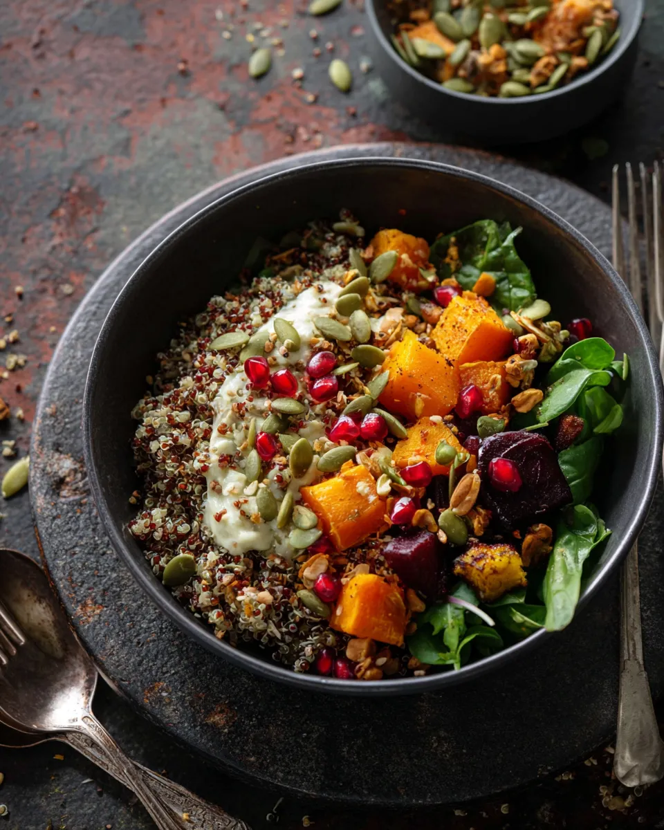 Plate the bowl in a way that pleases the eye: lay quinoa in a shallow ring, tuck the kale in a neat nest, and fan the squash slices on top. The contrast of warm squash, bright greens, and ruby pomegranate looks just as good on a Pinterest board as it tastes on the tongue.