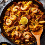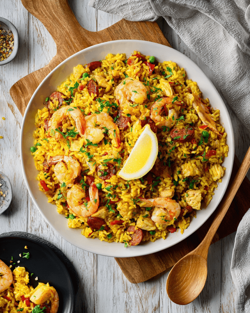 This homemade paella recipe brings all the vibrant flavors of Spain straight to your kitchen. Made with juicy chicken, smoky chorizo, fresh seafood, and saffron-kissed rice, it’s the ultimate one-pan dish for gatherings or cozy family dinners.