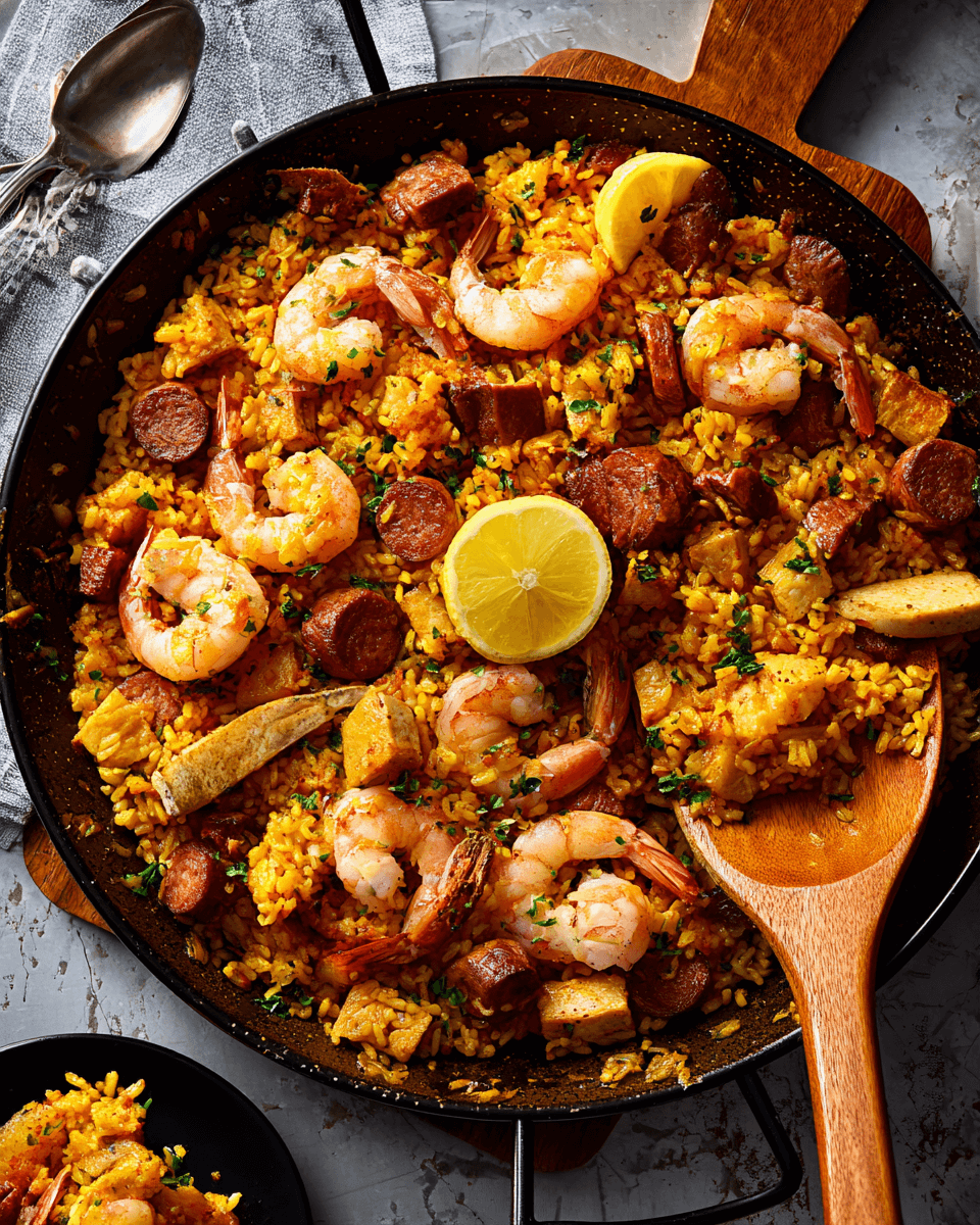 Chicken, chorizo, shrimp, mussels, and clams are classic choices. But paella is flexible—you can use squid, lobster, or even go fully vegetarian with beans and extra veggies.