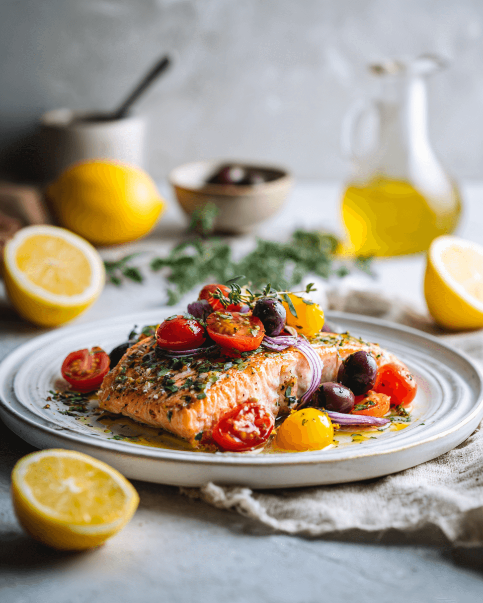 Keywords: Mediterranean salmon, healthy salmon recipe, one-pan dinner, 30-minute meals, weeknight salmon