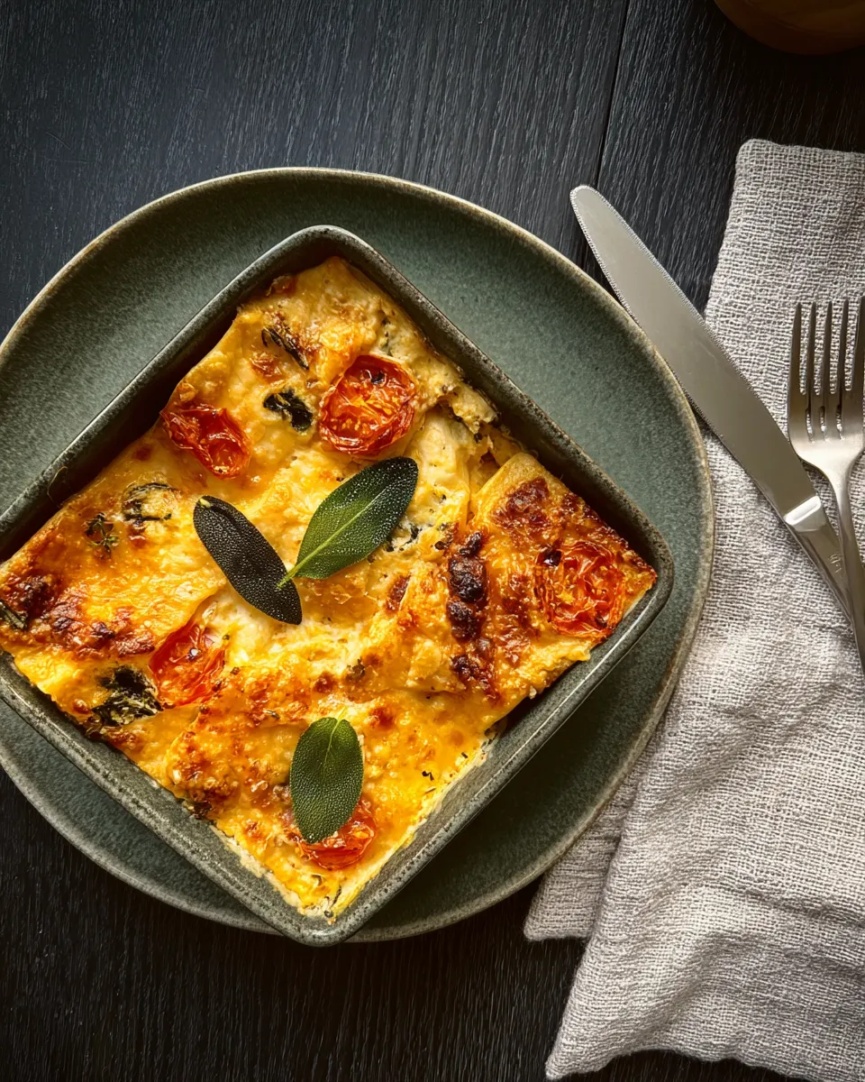 - Rest and finish: Let the lasagna rest 10–15 minutes before slicing to set the layers. Scatter crisped sage leaves and chopped parsley on top, and drizzle any remaining brown butter for shine and flavor.