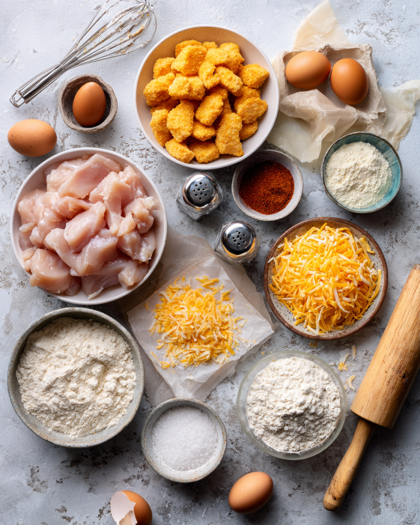 • Shredded cheddar cheese (½ cup) – Adds an extra layer of cheesy goodness that melts into the coating.