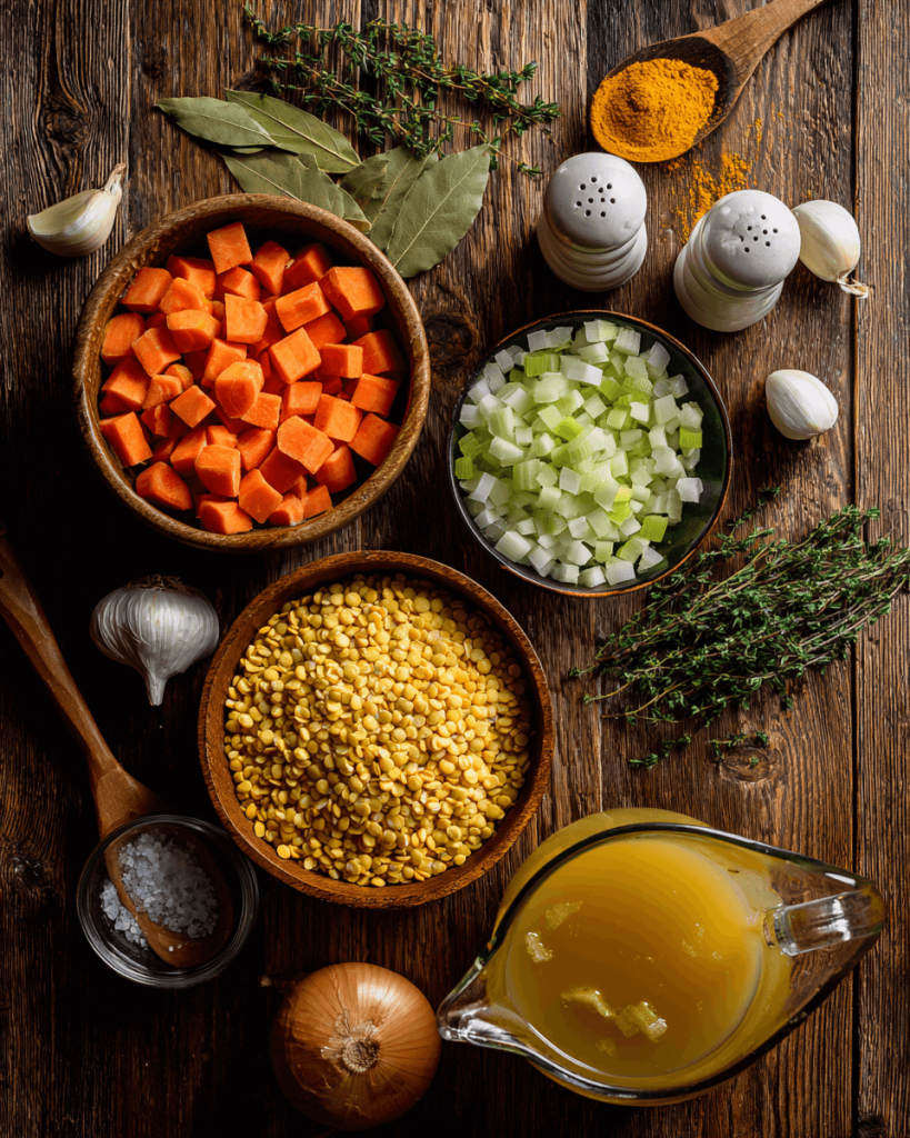 This yellow split pea soup is made with humble, feel-good ingredients that come together to create something deeply comforting. Each one plays a key role in building layers of flavor and texture — here’s what you’ll need and why it matters.