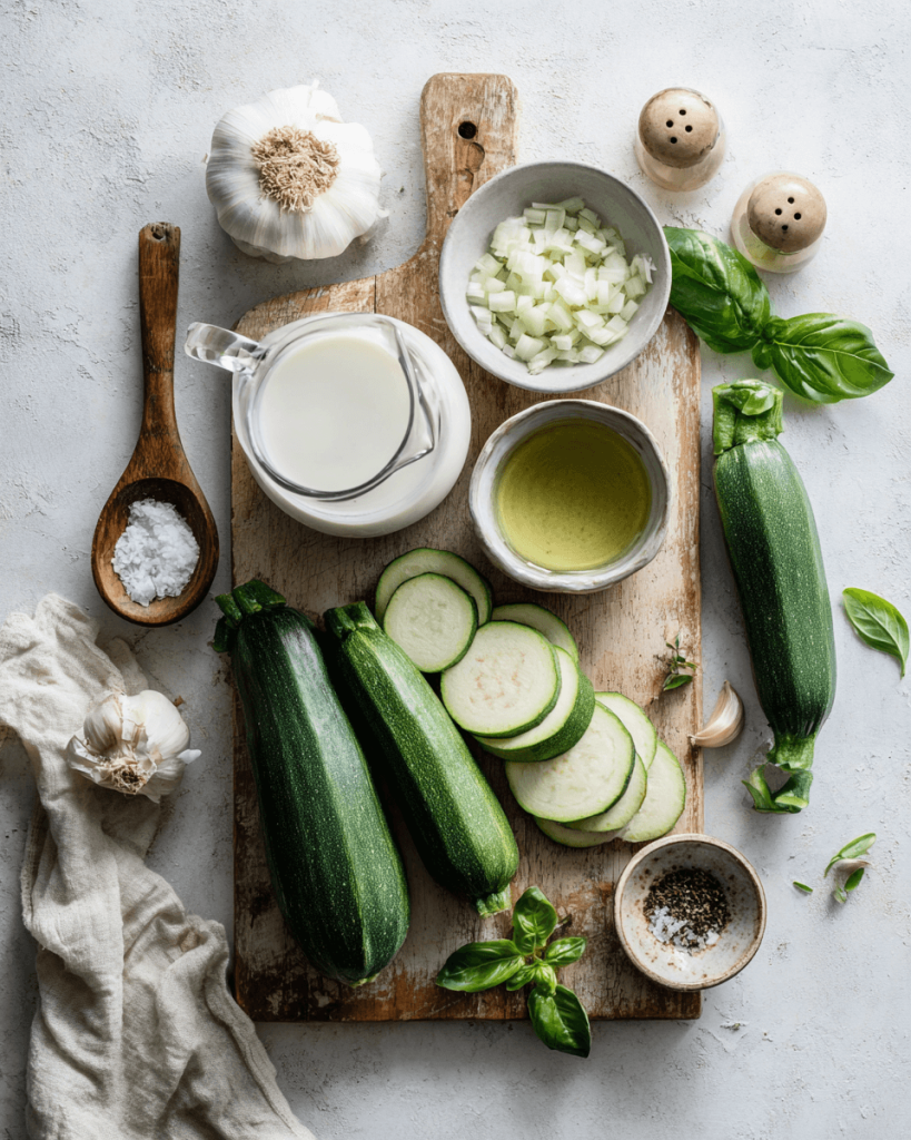 One of the best parts about this creamy zucchini soup is how simple it is — you only need a handful of fresh ingredients to create something bright, cozy, and nourishing. Here’s exactly what you’ll need, along with a few helpful notes to make your soup even better: