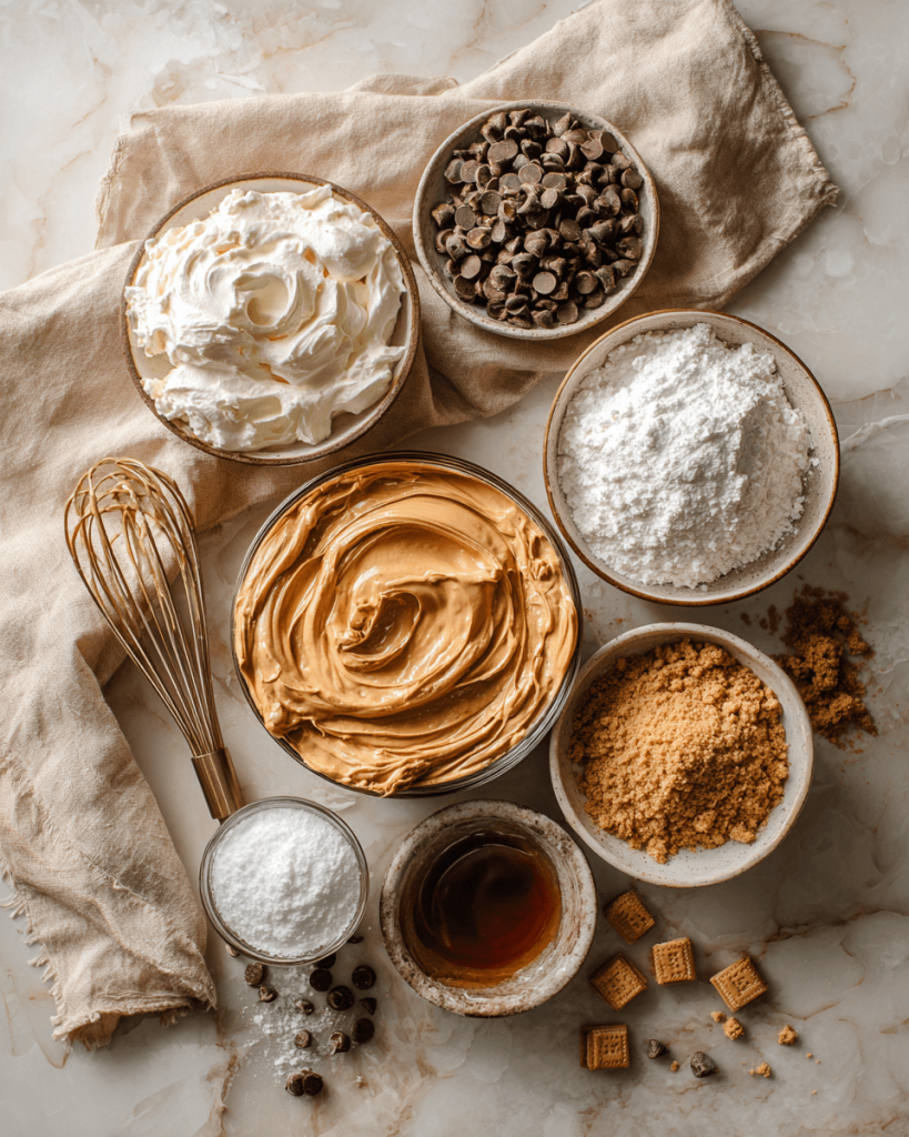 This pie comes together with a handful of pantry staples — nothing fancy, just simple ingredients that create pure dessert magic. Here’s what you’ll need to make your easy no-bake peanut butter pie: