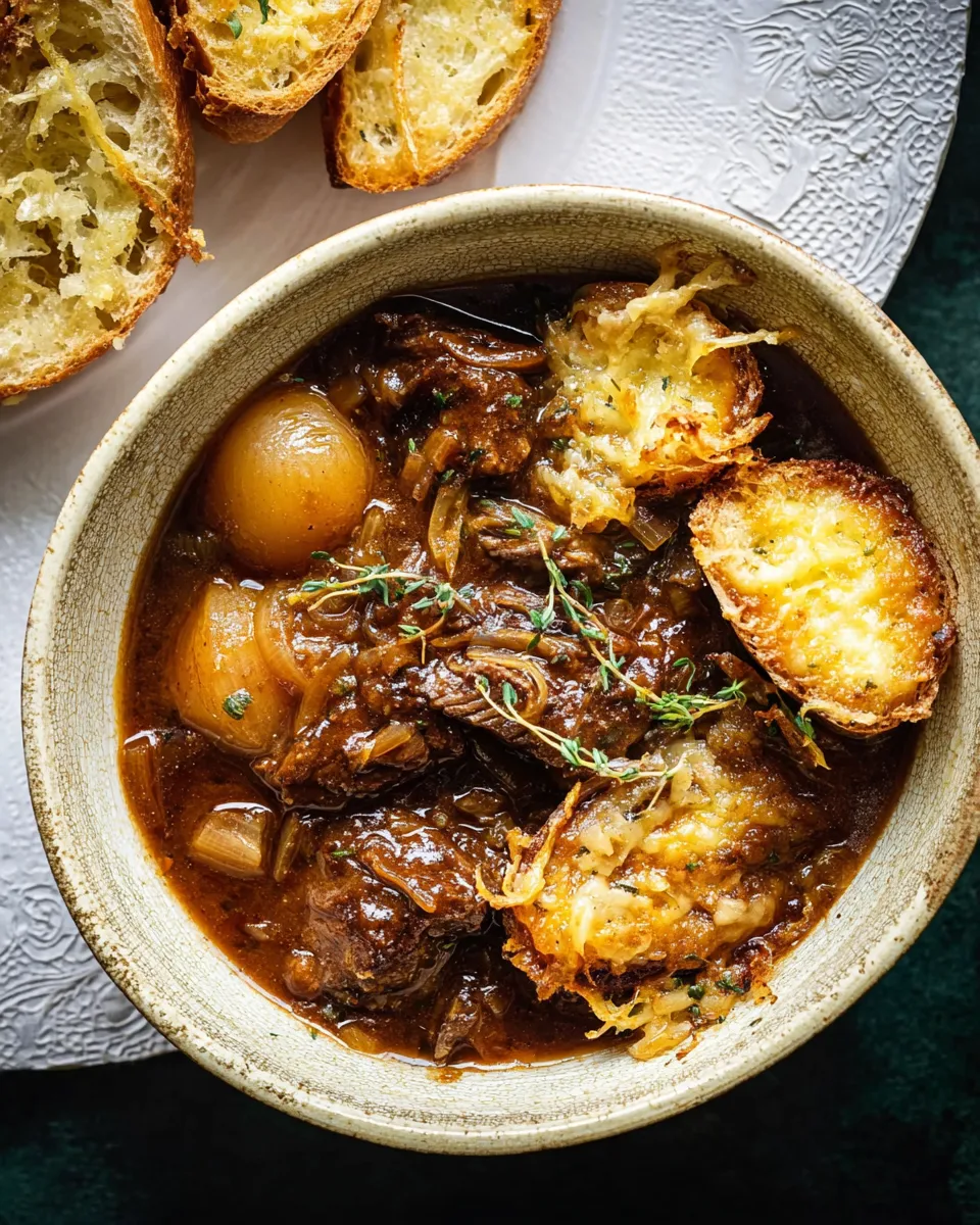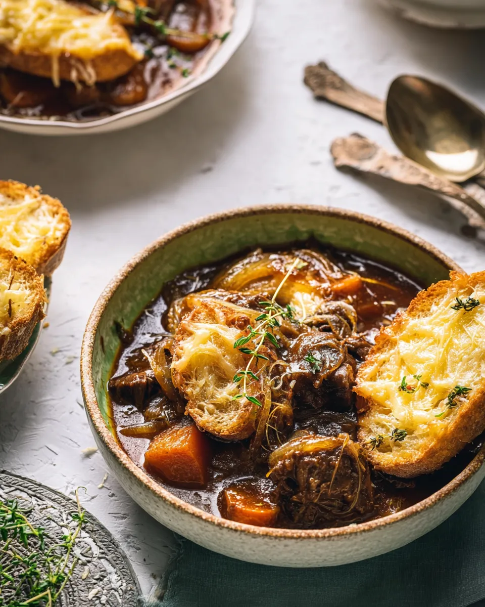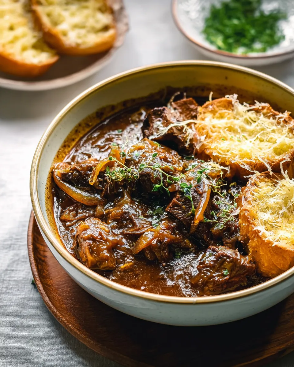 A cozy one-pot stew that marries long-caramelized onions with fork-tender beef in a rich, glossy broth. Optional broiled cheesy baguette toasts make it extra indulgent.