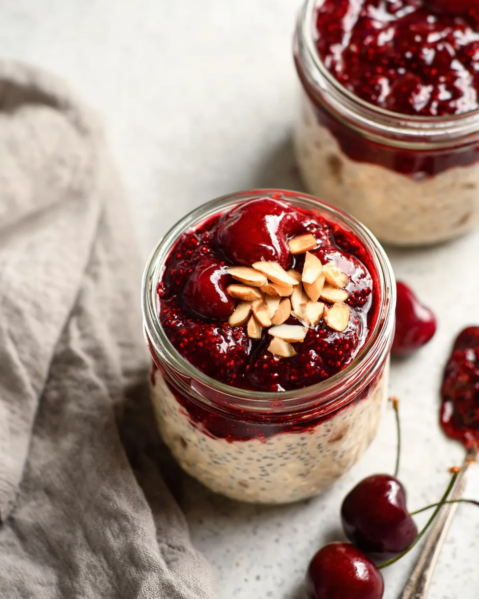 Keywords: overnight oats, cherry chia jam, make-ahead breakfast, breakfast jars, dairy-free, gluten-free, plant-based, healthy breakfast
