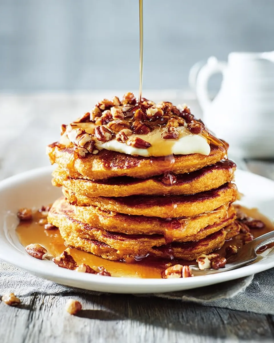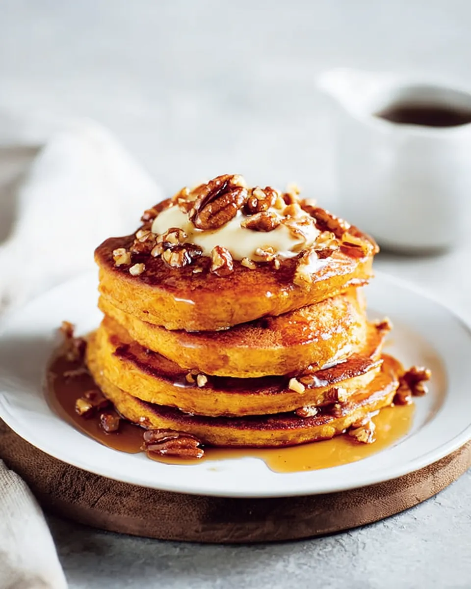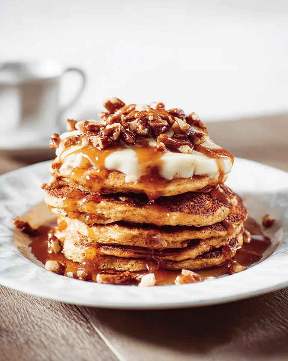 Pair these pumpkin-praline pancakes with crispy bacon or sausage links for savory contrast, a bright citrus salad on the side for balance, or a dollop of whipped cream if you’re treating yourself. A side of spiced sautéed apples adds another layer of fall flavor and makes the plate feel complete.